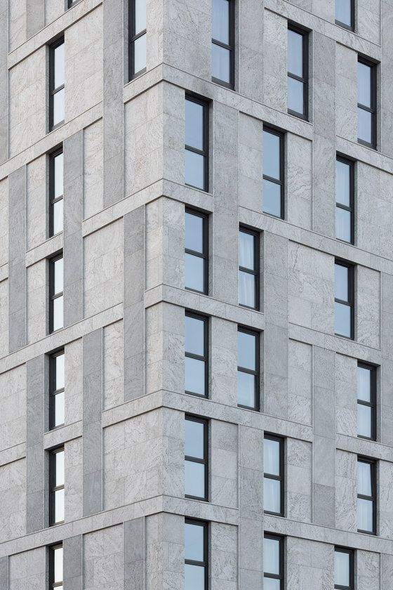 На фотографии один из примеров облицовки уже готового объекта в Санкт-Петербурге (ЖК на набКарповки, 31).